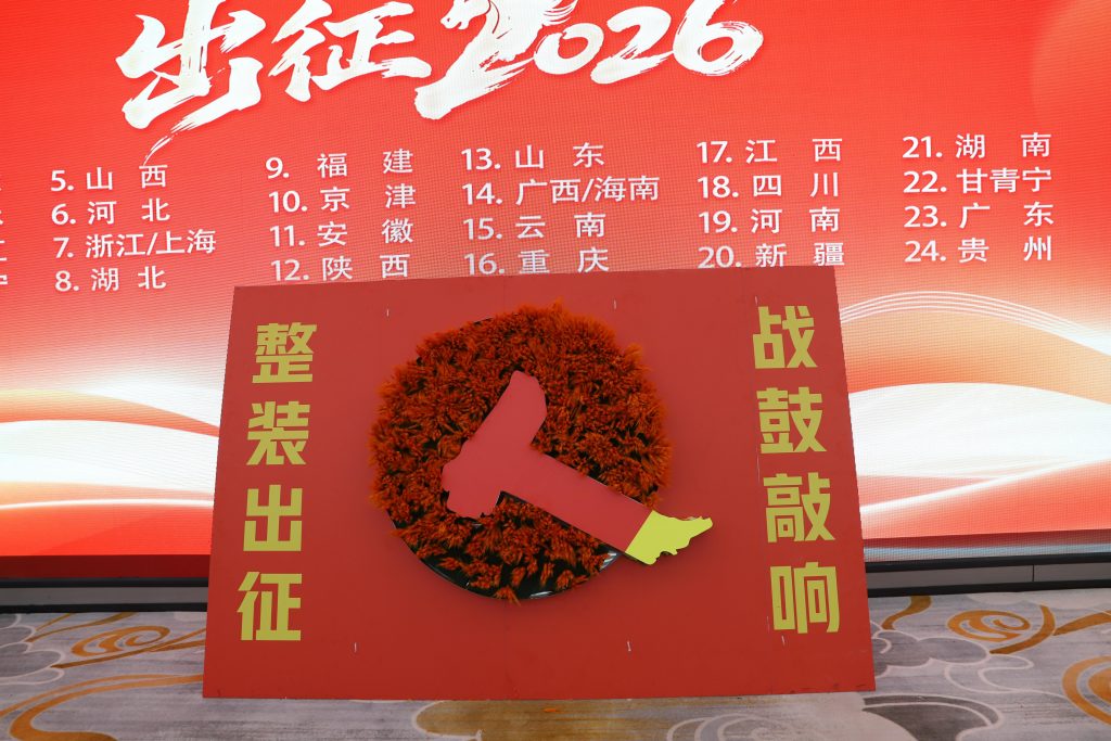 儀式進(jìn)入最高潮——擊鼓出征環(huán)節(jié)震撼上演。銷售管理部部長(zhǎng)熊迪凱揮槌擊鼓,三聲鼓響如春雷炸裂,振奮人心。各省區(qū)團(tuán)隊(duì)回聲嘹亮,口號(hào)震天,鼓聲與吶喊交織成出征的號(hào)角。全體將士邁著堅(jiān)定有力的步伐,正式踏上2026年的嶄新征程。