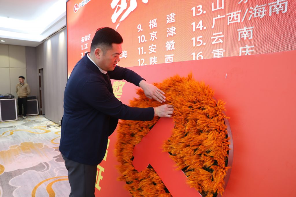 舞臺(tái)一側(cè),責(zé)任狀簽訂席莊嚴(yán)肅穆;舞臺(tái)中央,“仁和大麥墻”巍然矗立,金穗燦然,寓意業(yè)績(jī)“大賣”、碩果盈枝。在激昂奮進(jìn)的樂曲聲中,各省區(qū)團(tuán)隊(duì)依次登臺(tái)。團(tuán)隊(duì)成員手持金色麥穗肅立后方,象征同心共擔(dān)、使命共赴。李總首先為公司十周年員工頒發(fā)紀(jì)念相框,致敬他們與中進(jìn)風(fēng)雨同舟的堅(jiān)守。隨后,各省區(qū)團(tuán)隊(duì)將麥穗鄭重插入“大麥墻”,這一儀式感十足的動(dòng)作,寓意著將目標(biāo)扎根沃土,靜待豐收在望。
