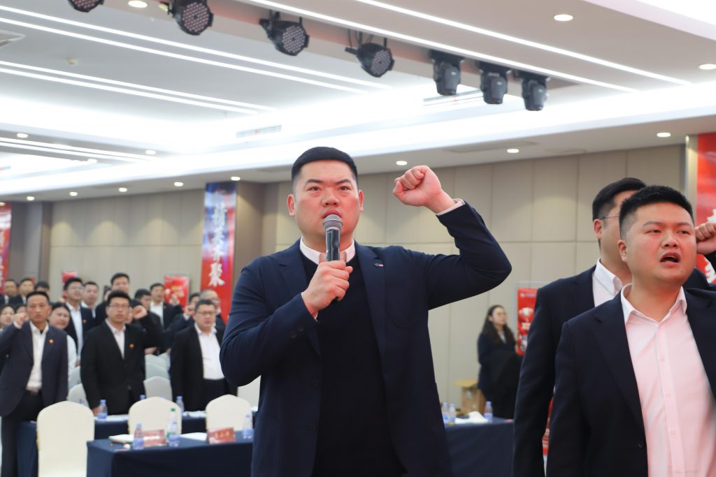 儀式在主持人劉永權(quán)莊重而富有感染力的開場(chǎng)中拉開帷幕,現(xiàn)場(chǎng)氣氛瞬間點(diǎn)燃。在各省區(qū)整齊列隊(duì)的見證下,公司總經(jīng)理李圳帶領(lǐng)全體市場(chǎng)營(yíng)銷將士高舉右拳,莊嚴(yán)宣誓。誓言錚錚,響徹全場(chǎng),這不僅是對(duì)年度目標(biāo)的堅(jiān)定承諾,更是中進(jìn)鐵軍勠力同心、使命必達(dá)的精神宣言。